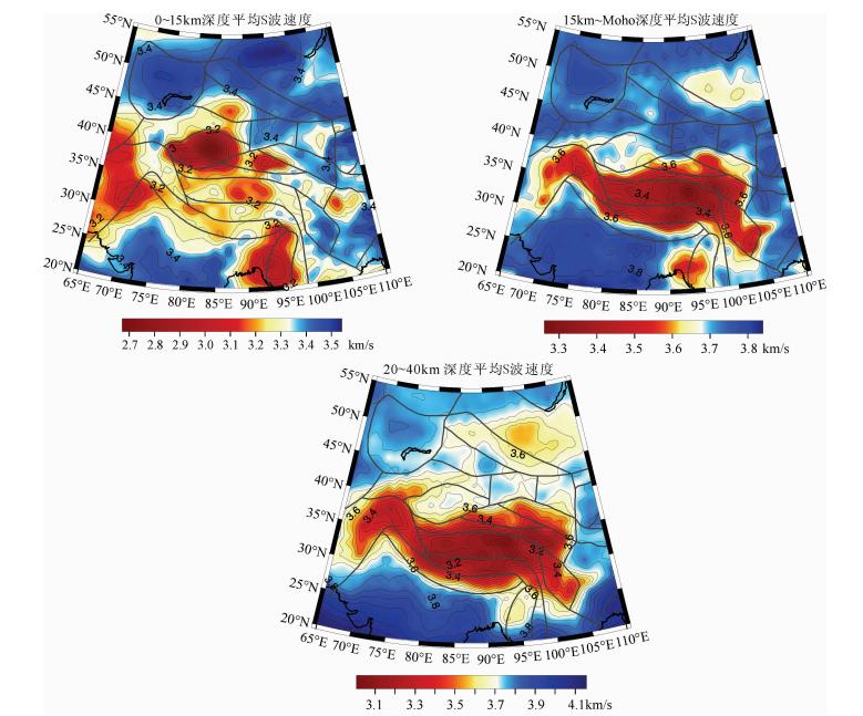 ![]() | 图 4 0~15 km(a),15 km~Moho(b)和20~40 km(c)深度平均S波速度分布 Fig. 4 Average S wave velocity in 0~15 km(a),15 km~Moho(b) and 20~40 km(c)depths |