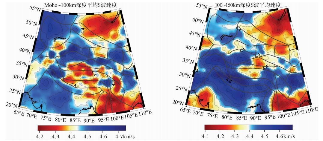 3.3 上地幔速度结构青藏高原的上地幔速度结构表现出与地壳完全不同的特征.图 5a和5b分别给出研究区莫霍面至100 km和100至160 km深度区间的平均S波速度分布.图中蓝色(高速上地幔)区域对应比较稳定的大陆地块,包括哈萨克斯坦、西伯利亚、塔里木、准噶尔、阿拉善、鄂尔多斯、扬子及印度等.与地壳的情况相似,研究区中有三个主要的上地幔低速区.比较图 4b、5a和5b不难发现,随着深度增大,西蒙古和缅甸弧后的低速区变得越发显著,而青藏高原低速区的范围逐渐变小,说明这些低速区的结构和形成机制有明显区别.