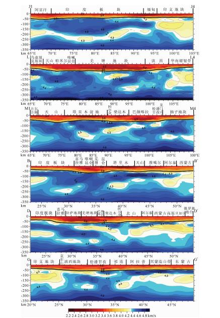 ![]() | 图 6 0~350 km S波速度剖面图(剖面位置见图 1) Fig. 6 S wave velocity profiles(see Fig. 1 for profile locations) |