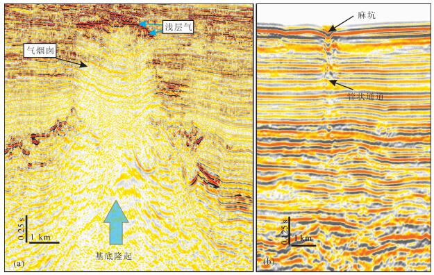 这个模型阐述了从气烟囱、泥底辟到泥火山的演化过程,对研究沉积盆地的流体活动和物质迁移非常重要.但是,也必须注意以下几个方面的问题:(1)该柱状流体活动系统的演化过程是单向的,不可逆的;(2)流体或物质的侵入往往是快速就位的.从某种意义上说,该模型主要是说明泥火山的形成过程,气烟囱和泥底辟属于中间产物.但是,并不是所有的气烟囱都会演化成泥底辟,也不是所有的泥底辟都会最终喷发到海底形成泥火山.它们的演化需要有持续的压力和物质的供给以及外部的触发条件,如地震等.另外由于侵位速度比较快,有时候我们观察不到气烟囱的形成过程;(3)柱状流体系统发育到海底并不是都能形成泥火山.受洋流等作用的影响,喷出的物质也可能被底流带走,而在海底侵蚀形成麻坑(Sun et al., 2011).另外,气烟囱和管状流体活动系统也可能发育到海底形成麻坑(图 3b);(4)泥底辟和泥火山的最主要特征是都发生物质和流体的迁移,而前者只侵入未喷发,后者在海底发生喷发.气烟囱和泥底辟/泥火山的最大区别在于气烟囱只有流体发生运移而无沉积物(泥质)发生迁移;(5)气烟囱中的“下拉”的地震反射特征是气体正在发生运移或者存在气体的表现.如果气体运移停止,这种“下拉”的地震反射特征会变弱或者消失;有些由于成岩作用还可能出现“上拉”的地震反射特征.但是,由于无泥质参与运移,其周围和上覆地层始终不会被动变形.可以根据这点仍然可以把气烟囱与泥底辟和泥火山分开.