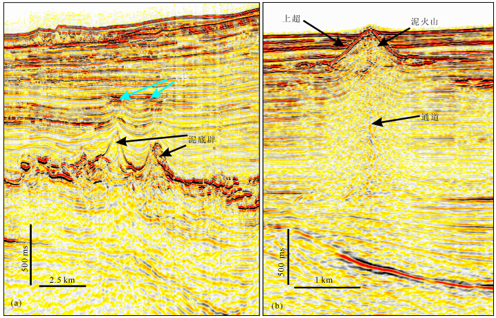 ![]() | 图 5 泥底辟和泥火山的地震剖面特征及主要区别 (a)泥底辟侵入到沉积地层中,造成泥底辟之上和通道附近的地层褶皱变形以及上部的地层发生断裂,断裂继续输送流体而形成强振幅(气体)反射;(b)泥火山喷发到古海底,喷发之后的沉积物上超在泥火山之上,泥火山在形成过程中也会造成通道附近的地层形成被动褶皱.Fig. 5 Seismic features of mud volcanoes and mud diapirs (a)Intrusion of mud diapir causes stratum folds at the top and around the diapir and the occurrence of faults in overlying strata. Enhanced reflections occur along the faults;(b)Sediments overlap along the flanks of mud volcanoes. Folded strata are also observed along the mud volcanoes. |