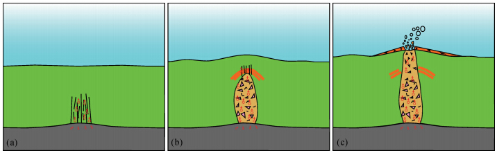 本文认为气烟囱/管状流体活动系统、泥底辟和泥火山存在下列的演化关系.(1)气烟囱的形成(图 7a).当地层中的超压超过地层的屈服压力,在沉积地层的薄弱地点(如地层隆起高点等)将会首先发生水力压裂.从而产生大量的裂隙.流体将会沿这些裂隙发生垂向运移.裂隙及其运移的流体共同造成了通过地震所观察到的地震异常(如杂乱反射、空白带和弱振幅带等)(图 3).实验研究证明,少量的流体就能够造成很大的波阻抗差异,从而形成比较强烈的振幅异常(Judd and Hovland ,2007).所以,从某种程度上说,气烟囱只是代表一种地球物理异常.水力压裂所造成的裂隙规模比较小,用现在的地震手段很难对其进行详细的识别和刻画.但是,目前从野外露头观测中,发现确实有大量的裂隙存在于气烟囱带中(LØseth et al., 2011).(2)泥底辟的形成(图 7b).当母源区的超压异常非常大时,母源区的物质和流体就会沿着裂隙一起垂向运移.这样就造成了通道中的沉积物质被搅拌混合,母源物质夹杂围岩碎屑以及大量的流体向上侵入.物质的侵入造成了由地震所观察到的围岩和上覆地层的被动变形(褶皱)以及上覆地层中的断层的产生(图 5a).(3)泥火山的形成(图 7c).当侵入物质突破上覆地层的束缚,喷发到海底,就形成了泥火山.泥火山在形成的初期喷发会非常强烈,绝大多数的物质和气体(甲烷等)都是在这个时期被喷发到海底或者释放到大气中(Dimitrov,2003).之后,泥火山会进入时间较长的休止期,直到压力再次聚集达到喷发的强度.
