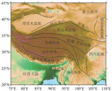 ![]() | 图 1 中国西部及邻区地貌和构造纲要图Fig. 1 Map of topography and tectonic outline in western China and adjacent areas |