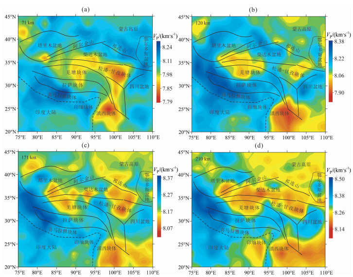 ![]() | 图 2 青藏高原及邻区71~210 km深度的P波速度分布图Fig. 2 P-wave velocity maps at 71~210 km depths beneath the Tibetan plateau and adjacent areas |