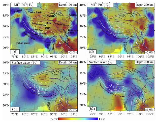 在青藏东部和东南边缘,郭飚等(2009)利用体波层析成像方法反演了川西及龙门山地区的地壳和上地幔结构,结果表明四川盆地以高速为特征的岩 石层深度可达250 km,而松潘—甘孜地区至300 km 深度时速度仍然偏低.Bai等(2011)根据川西地区流动观测资料反演的P波速度结构也揭示出类似的特征.胡家富等(2005)和张晓曼等(2011)利用面波和接收函数反演了哀牢山—红河地区的S波速度结构,发现滇西的保山、畹町、沧源、思茅一带70~120 km深度均为低速区.苏伟等(2002)的面波层析成像也揭示出滇缅地区55~150 km深度的低速异 常.Li 等(2008)的研究表明,在喜马拉雅东构造结附近,腾冲火山区下方的低速异常达到150 km的深度,并且随着深度的增加进一步向东扩展.而Lei等(2009)的研究则证实,滇西腾冲火山区下方的低速异常向东扩展并延伸至400 km的深度.