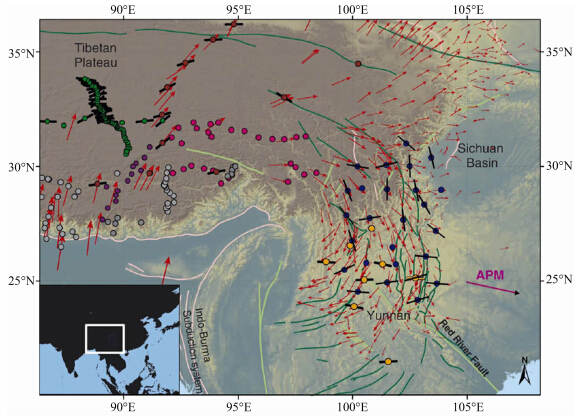 值得关注的是青藏高原东南边缘的地幔各向异性自北向南发生了变化,即快波方向从北纬26°以北的南北方向转为北纬26°以南的近东西方向.Lev等(2006)和Flesch等(2005)认为产生这一变化的原因与岩石层流变结构的横向变化有关;胥颐等(2012a)分析了青藏东南边缘上地幔的速度结构,发现北纬26°以南的滇西地区P波速度和S波速度普遍偏低,低速区的范围与地幔各向异性的变化非常一致,深度也与各向异性层相当,推测产生地幔各向异性的原因为介质的韧性变形,进一步厘定了滇西地区地幔各向异性变化的深层介质条件.