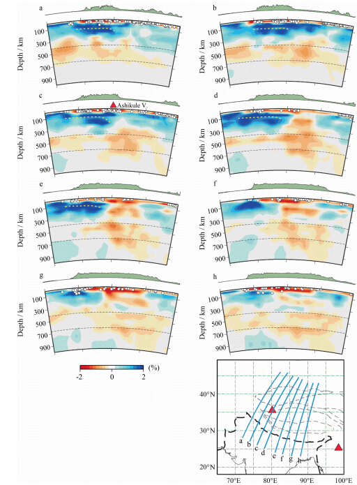 ![]() | 图 5 印度大陆岩石层向青藏高原挤入俯冲的速度图像(Wei et al., 2012)Fig. 5 Velocity images showing penetration of the Indian continental lithosphere beneath the Tibetan plateau(Wei et al., 2012) |