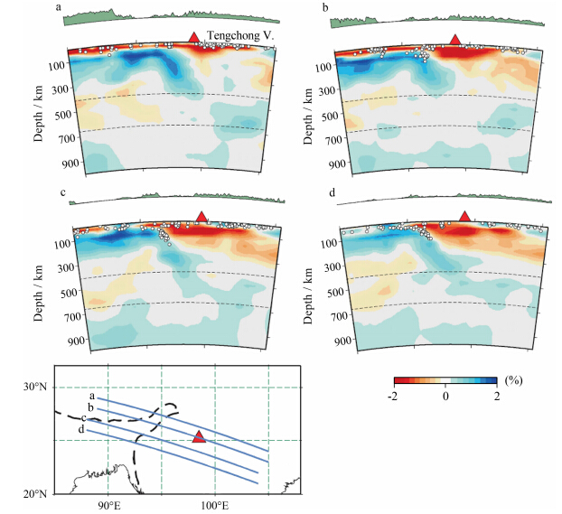 ![]() | 图 7 穿过缅甸弧和腾冲火山区的P波速度剖面(Wei et al., 2012)Fig. 7 P-wave velocity profiles across the Burma arc and Tengchong volcanic area(Wei et al., 2012) |