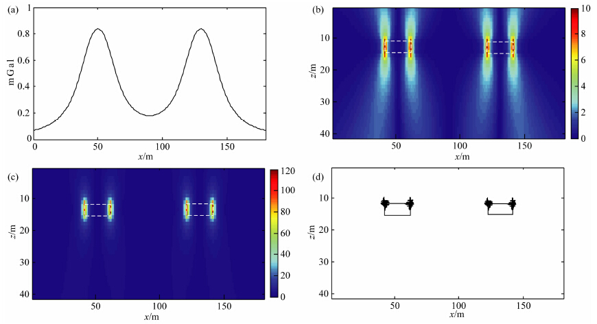 3 理论模型试验利用长方体产生的剖面重力异常来验证归一化总水平导数法的应用效果(图 1).图 1a为中心位置 分别为50 m和130 m,上、下顶埋深均为12 m和15 m,与围岩的密度差为1 g/cm3,宽度为10 m的两个板状体所产生的重力异常.