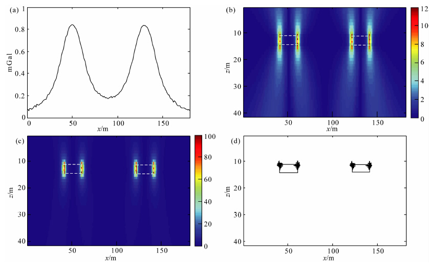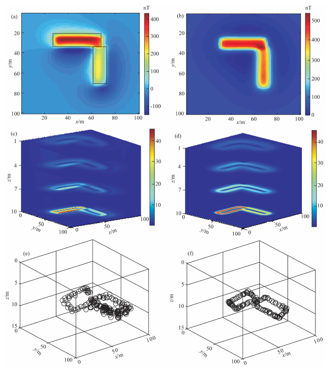 下面验证一下本文方法在二维情况下的应用效果.图 3a为埋深分别为11 m和13 m的正方体所产生的重力异常.图 3b为图 3a所示异常的总水平导数,从图中可以看出总水平导数能清晰地识别出较浅地质体的边界,而所得到的较深地质体的边界则比较模糊,且相对理论边界要大一些.图 3c为空间归一化总水平导数结果,通过空间归一化总水平导数空间不同位置的幅值特征可判断出地质体的埋深.为了更加清晰地显示出地质体的边界,图 3d给出了3、5、7、9、11、13 m深度上归一化总水平导数的极大值点的位置,通过该结果可以看出随着下延深度的增加归一化总水平导数所识别出的异常体的水平位置与真实边界更加接近,通过最大值的分布可判定出正方体的埋深分别为11 m和13 m.利用归一化总水平导数欧拉反褶积法估算异常体的位置参数,窗口大小为7×7.图 3e为利用该方法计算得到的异常体的位置分布,图 3f为该方法反演结果的三维显示,反演得到的异常体的平均深度分别为10.7 m和12.6 m,结果与理论埋深相一致.
