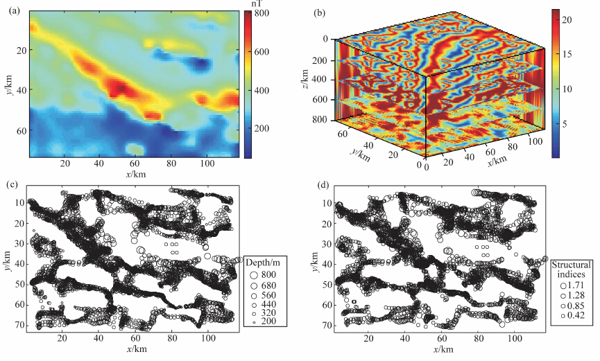 图 5a为朱日和地区化极后磁异常,测量点距为250 m.图 5b为空间归一化总水平导数结果.可以看出异常体的走势及异常体的大致埋深,深度在400~600 m之间,且根据不同深度极大值点的变化可判断出异常体的延深方向为东南.图 5c为归一化总水平导数欧拉反褶积计算结果,窗口大小为5×5.可以看出异常体的深度大多集中在400~600 m之间,与前一种方法得到的结果一致.图 5d为反演得到的异常体的构造指数,构造指数范围为0.42~1.71,其均值为1.12,地下地质体接近于脉状分布.由于异常体的不规则形与异常体之间的相互干扰造成构造指数并不是一个整数,很多作者也证明了这一点(Salem et al.,2008; Fedi et al.,2012).