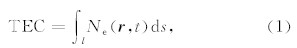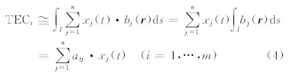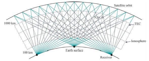 电离层层析成像就是根据反演区域内的一系列卫星信号传播路径上的TEC信息来反演所选定区域内电离层电子密度的时空分布.如图1所示,在利用卫星信号观测进行的电离层层析成像过程中,所获得的电离层电子总含量(Total Electron Content, TEC)是电离层电子密度沿卫星至接收机射线路径上的积分(Liu, 2004; 邹玉华, 2003),可表示为