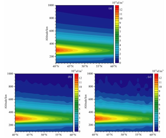 ![]() | 图2 10°E子午面上电离层电子密度剖面图 (a) IRI2007模型获取的;(b) ASIRT算法重构的;(c)SIRT算法重构的. Fig.2 IED profiles at 10°E by different algorithms (a) IRI2007 model; (b) ASIRT algorithm; (c) SIRT algorithm. |
