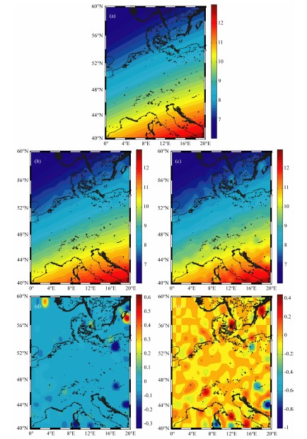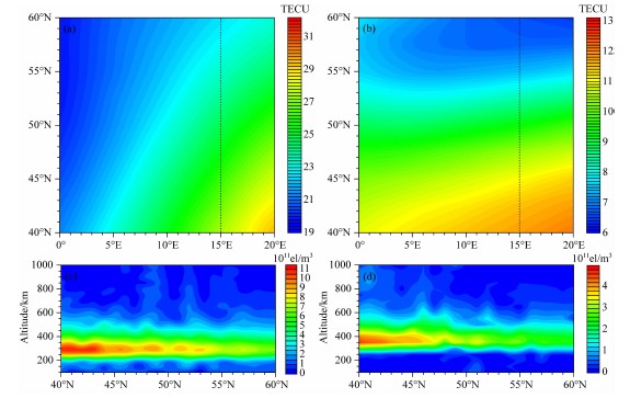 ![]() | 图4 TEC分布及重构电离层电子密度分布 (a)和(c)是9 ∶ 00UT;(b)和(d)是23 ∶ 00UT.(a)和(b)为TEC图; (c)和(d)为15°E的垂直剖面图. Fig.4 Images of TEC distribution and reconstruction IED (a) and (c) 9 ∶ 00UT; (b) and (d) 23 ∶ 00UT. (a) and (b) TEC; (c) and (d) Vertical cross-sections along 15°E. |