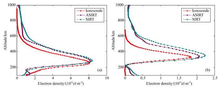 如图4所示,(a)和(c)给出了UT9 ∶ 00时的分 布,(b)和(d)给出了UT23 ∶ 00时的分布,分别代表了白天和夜晚电离层电子密度的空间分布.(a)和(b)是实际空间的TEC分布,(c)和(d)是15°E的垂直剖面.从中可看出,利用ASIRT反演的电离层电子密度随着纬度的增大而逐渐降低,大体上与实际空间的TEC分布走向相符合,说明该算法是可行的.为了验证算法的可靠性,将反演结果与测高仪数据进行比较.图5展示了不同时刻的电离层测高仪 所得剖面与ASIRT和SIRT两种算法反演结果的比较, (a)和(b)分别为UT9 ∶ 00时和UT23 ∶ 00时的电子密度剖面的比较结果.从比较结果来看,ASIRT反演结果整体上与测高仪数据更为接近.说明ASIRT反演的精度确实优于SIRT.然而,在垂直方向上,这两种算法反演的结果与测高仪数据均存在一定差异,原因是观测信息不足导致垂直分辨率不高.