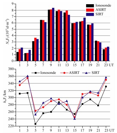 图6展示了一天12个反演时段内两种算法层析反演获得的F2层电子密度峰值(NmF2)和F2层 电子密度峰值高度(hmF2)与电离层测高仪站观测数据的比较结果.从中可以看出,两种算法反演获得的F2层电子密度峰值与测高仪观测结果总体上符合较好,但ASIRT算法总体上更接近于测高仪观 测结果.然而,F2层的峰值高度与测高仪存在一定 的差异.由于观测噪声、电离层空间离散误差以及测站几何结构限制等因素,使得反演结果的垂直分辨率较差.这说明在电离层层析成像过程中仅仅通过改进反演算法来改善电子密度空间结构(特别是垂直分辨率)是不够的,利用其他技术增加用于反演的观测信息是解决这一问题的最根本的手段.