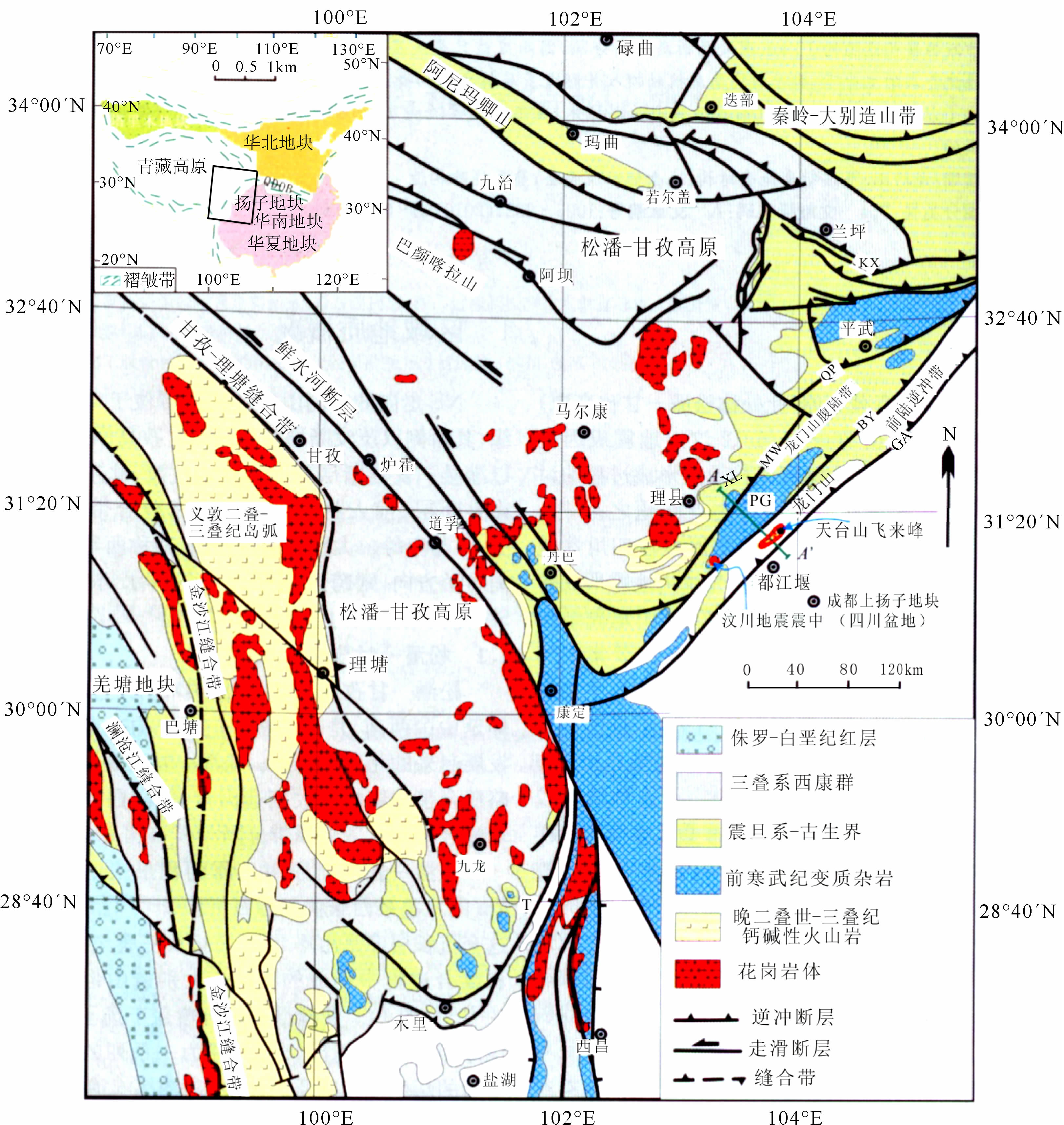 青藏高原东北缘是印度洋板块与欧亚板块、即 两陆-陆碰撞、长期挤压,而作用力系由近北东—北东东、乃至东南方向转换的重要场所,是高原东部深部壳、幔物质向东或东南流展的汇聚地域.由于受到东侧的扬子克拉通、东北侧的华北陆块和阿拉善陆块的阻隔以及东北缘柴达木盆地、松潘—甘孜地块的挤压和强烈变形,故形成了东南部龙门山断裂系、北部的祁连山造山带和东北缘的昆仑—西秦岭造山带等走向各异的青藏高原东北缘构造域.因此,松潘—甘孜与龙门山断裂系及扬子克拉通西北部的四川盆地乃是中国大陆东西与南北复杂构造的结合部和重要的构造变异地带.这里构造运动和地震强烈活动,且聚集了丰富的矿产资源,故充分体现了其深部物质与能量尚在进行着强烈交换.青藏高原东北缘和川滇西部地域深部物质向南或向东南方向的强烈流展共同反映了块体的向南和向东南运动(熊熊和滕吉文,2002;滕吉文,1996a,b).它们的强烈滑动亦共同反映了喜马拉雅弧形造山带的“东构造结”地带壳、幔物质的重新分异、调整和强烈交换与在大型走滑断裂带为通道边界的物质运移(滕吉文等,2006).