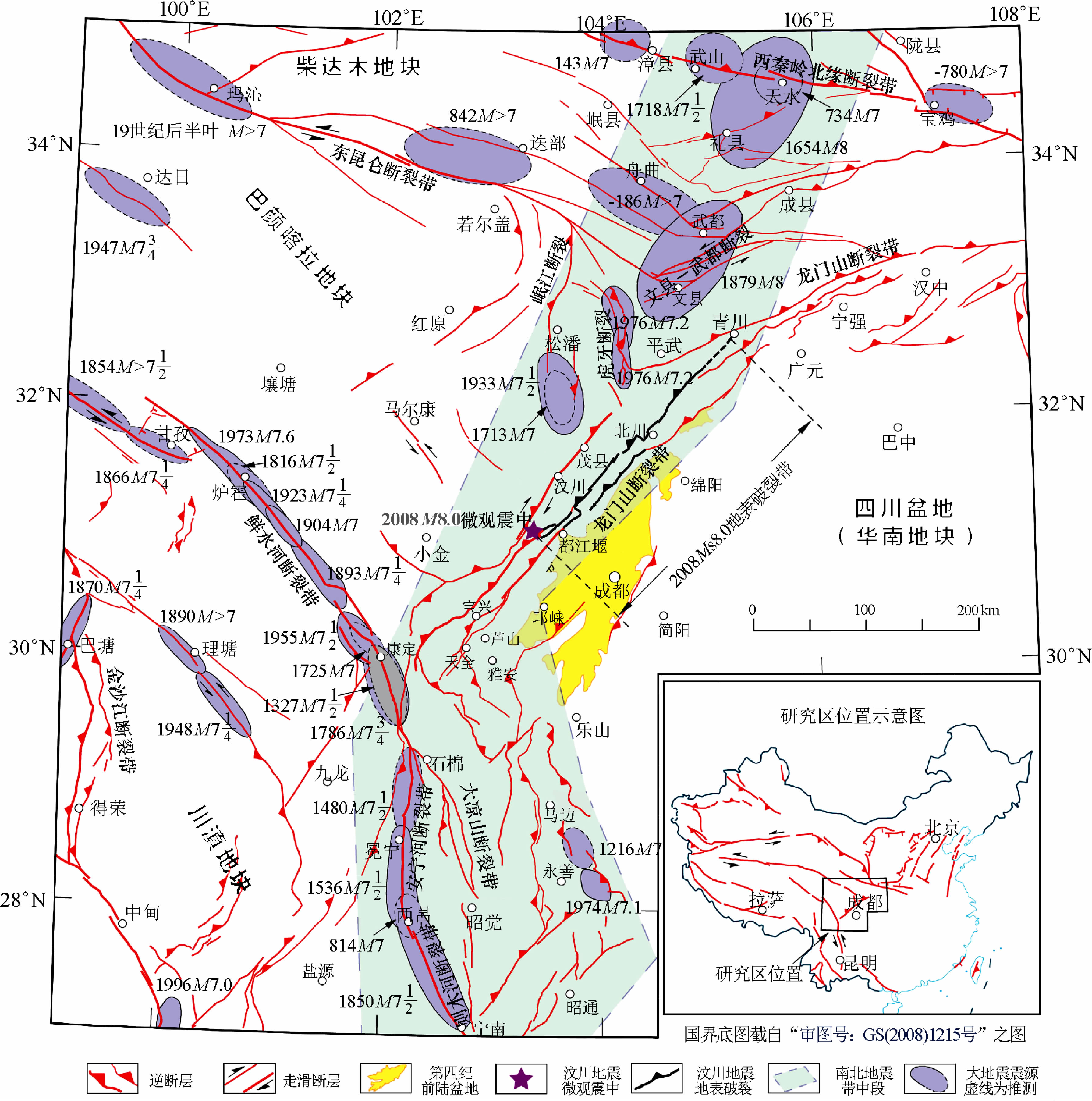 龙门山推覆构造带在地史期间曾经历了印支期、燕山期和喜山期等多期次构造运动的作用和改造,特别是喜山期强烈的陆-陆板块碰撞和高原的急剧隆升,且在印度洋板块与欧亚板块强烈碰撞、挤压作用下,四川盆地与龙门山断裂系和川西高原深部物质与能量进行着强烈交换,故促使龙门山造山带的形成,且在川西高原内又形成了走向交替的一系列局部构造并构成了该区错综的特异构造格局.基于该区鲜水河断裂带,安宁河—则木河—小江断裂带和龙门山断裂系三者呈“Y”字形展布的活动断裂带所组构的南北地震带主体,而在历史上强裂地震 曾频频发生(图2).为此怎样厘定汶川—映秀MS8.0 大地震发生的发震断裂带则是关系到这次地震形成的机制及其特殊性,即是一个十分重要的科学问题.