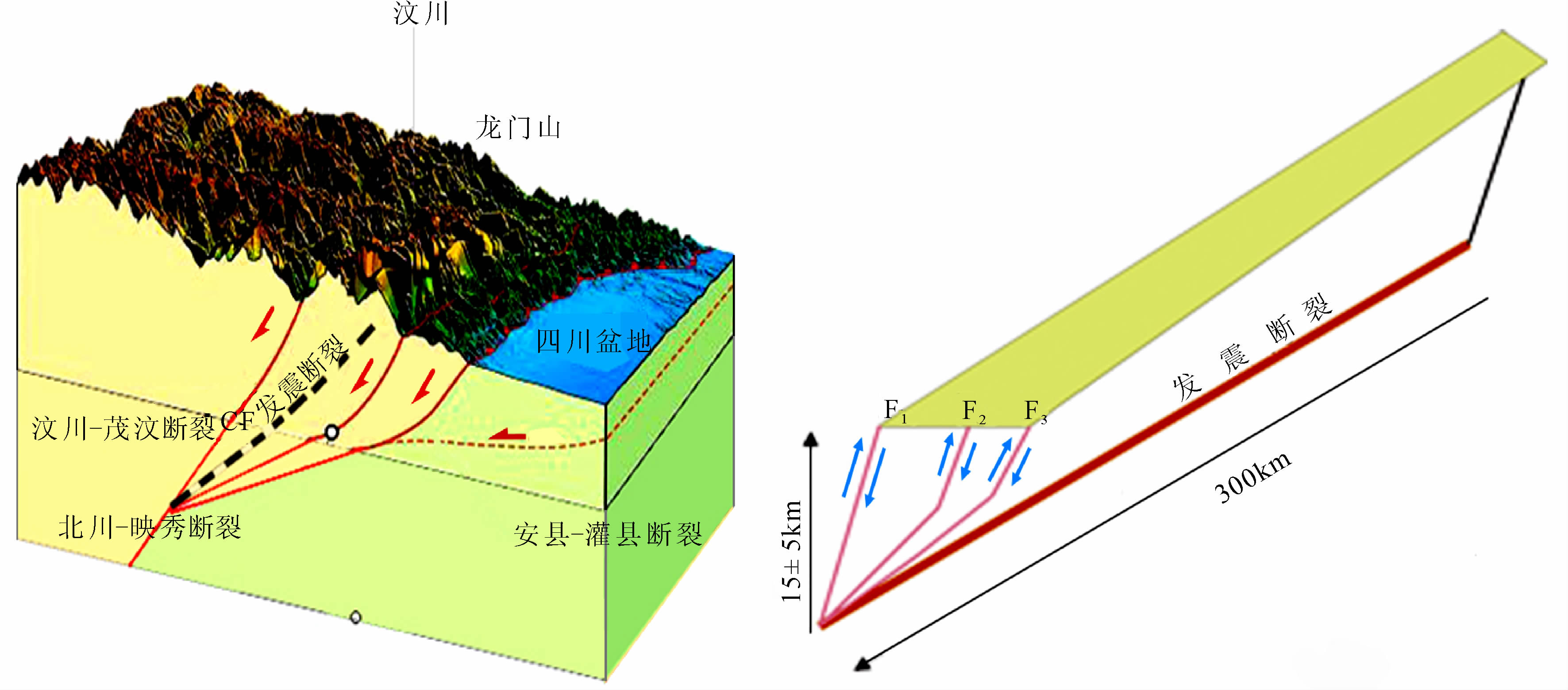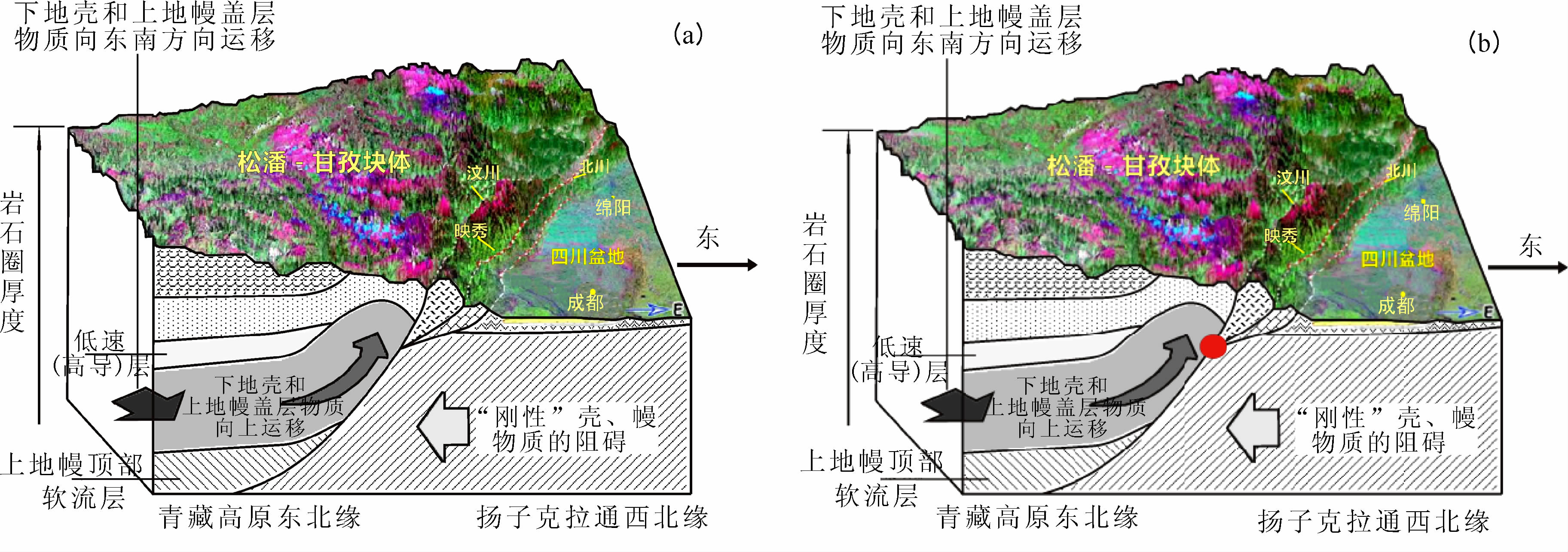 在印度洋板块与欧亚板块,即两陆-陆板块NS向碰撞、挤压和EW向拉张力系共同作用下,青藏高原东部下地壳与上地幔盖层物质呈整体同步运移,且在这一相对于龙门山断裂系和四川盆地壳、幔介质整体较软弱的松潘—甘孜地域继续并逐抬升(垂向变形).由于在向E和ES方向运移进程中又受到其东南侧扬子克拉通西北部四川盆地岩石圈高速、高阻和高密度坚硬物质的阻隔,故才使得在松潘—甘孜块体与四川盆地之间形成了强烈的挤压,并构成了物质与能量强烈交换和应力在这里不断积累的深部动力作用的力源环境.