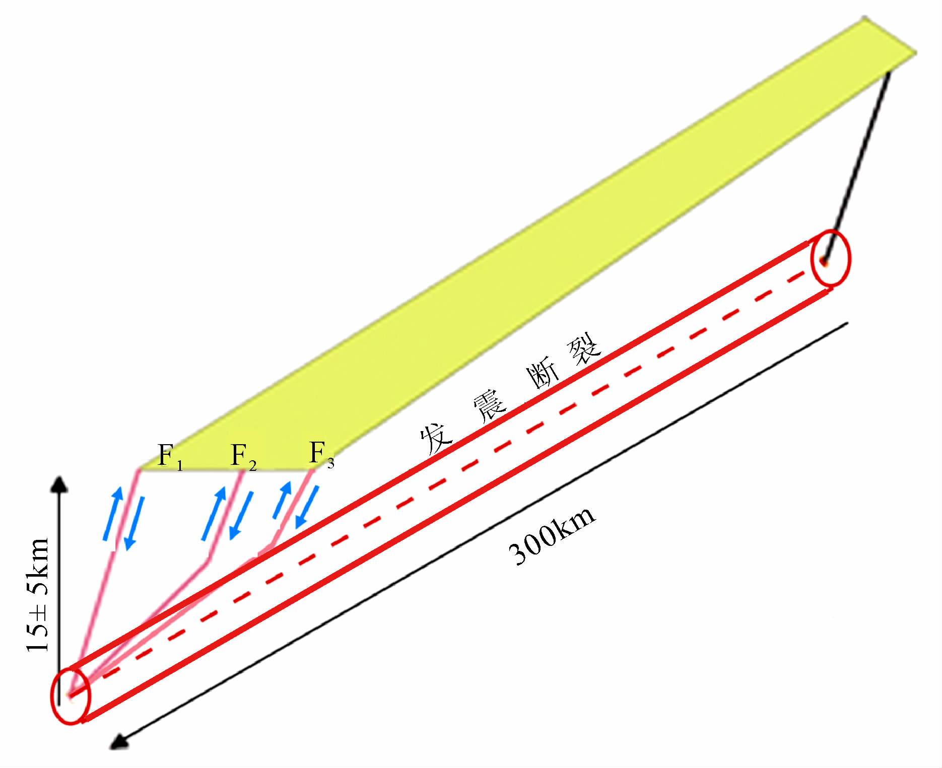 由于该区主震和余震均沿龙门山断裂系呈NE方向展布,且分布在SW向宽度为60~80 km,长近300 km的范围内,而主要集中在宽近30~40 km范围内,即基本上分布在龙门山后山断裂与前山断裂之间.显见,即便是套用与震中位置靠近的断裂亦难以确定它们与地表断裂的归属关系.因为由地表到15±5 km深处龙门山断裂系所辖主震和余震分布地带的介质和结构都是非均匀的,各向异性的和呈非线性变化的.