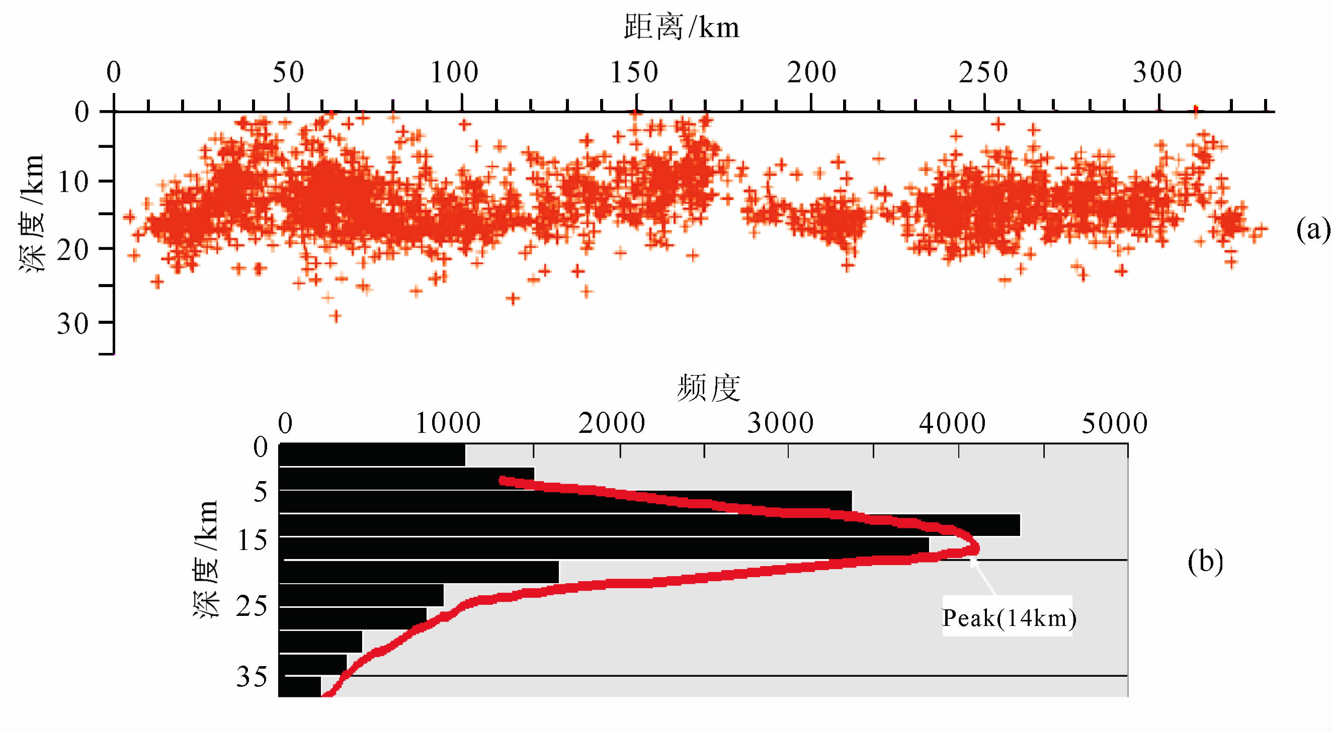 ![]() | 图5 汶川MS8.0大地震和余震震源深度分布图 (a) 地震震源深度分布剖面;(b) 地震震源深度统计峰值深度分布 Fig.5 The distributional map for depth of focus of major shock and aftershocks of Wenchuan earthquakes (a) Distribution for depth of focus;(b) Distribution of statistical peak depth. |
