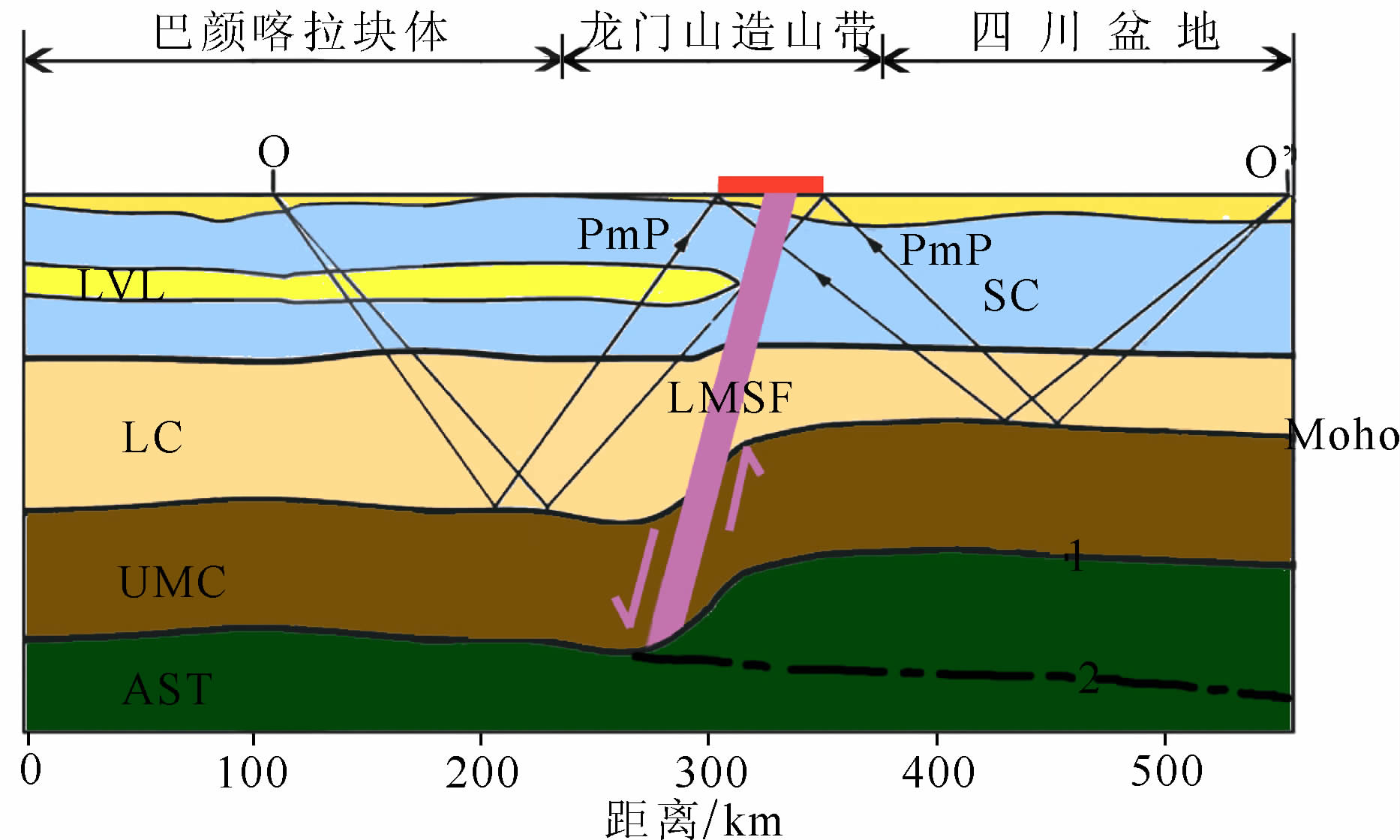 ![]() | 图6 巴颜喀拉块体—龙门山造山带—四川盆地地带地壳与上地幔平均结构剖面示意图 O,O′:震源点;SC:上地壳;LVL:地壳低速层;LC:下地壳;Moho:地壳底界面;UMC:上地幔盖层;LMSF: 龙门山断裂带; AST:软流圈;1,2为在四川盆地软流圈深度的两种方案 Fig.6 Schematic diagram for average structure of crust and upper mantle along the profile from Bayan Har block-Longmenshanorogenic-Sichuan basin. O,O′: Source points; SC: Upper crust; LVL:Low velocity layer of crust; LC: Lower crust; UMC: Covering strata of upper mantle;LMSF:Longmenshan fault; ASF: Asthenosphere; 1,2 deep of Asthenosphere by two program in Sichuan basin. |