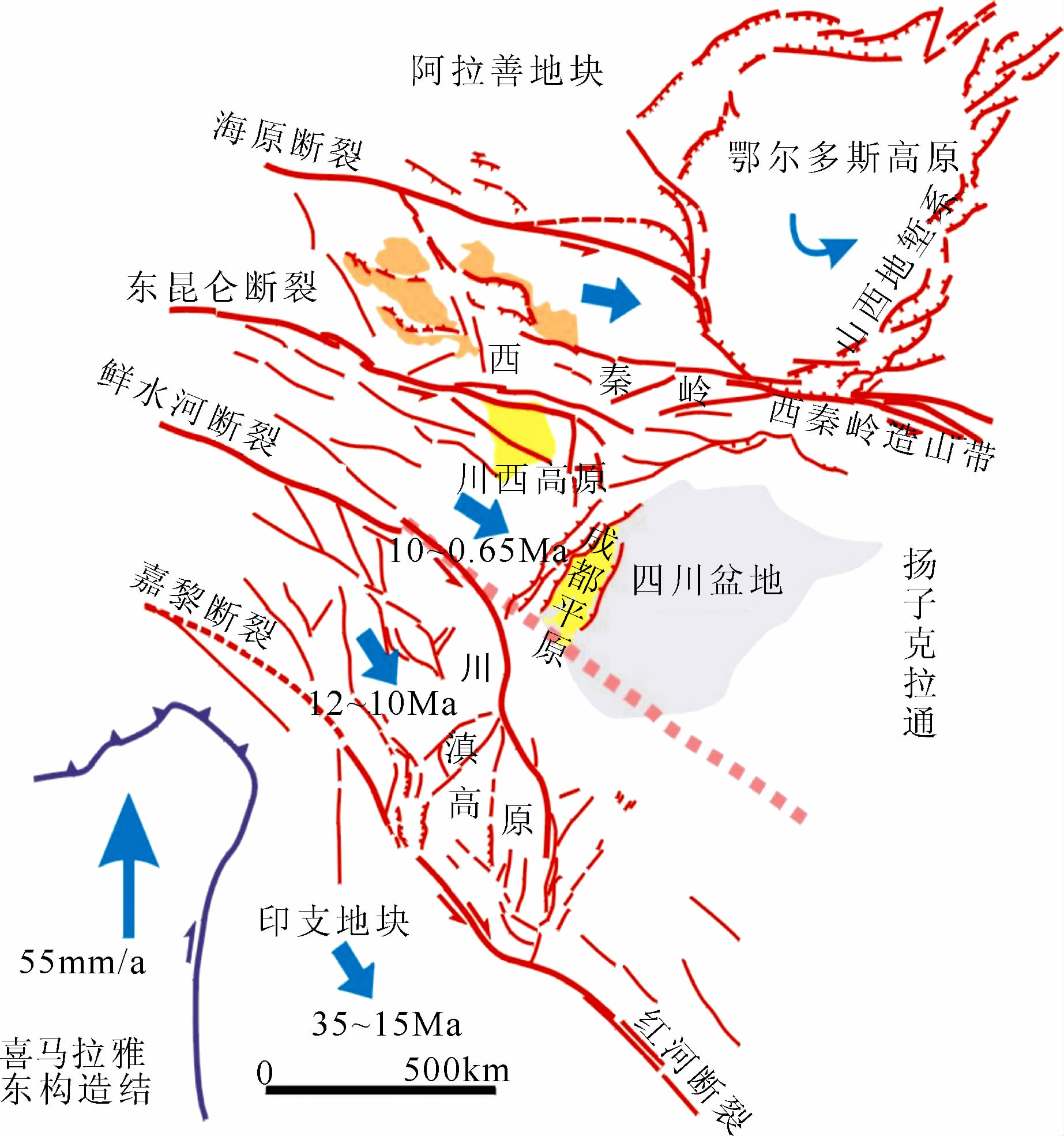 由于冈瓦纳古陆的解体和印度洋中脊的扩张,使得印度洋板块分块向北漂移,并在两陆-陆板块碰撞和挤压作用下,形成了沿喜马拉雅弧形造山带和一系列向南凸出的弧形构造体系(滕吉文,1996a,b;滕吉文等,2006).在喜马拉雅造山带的西端形成了“西构造结”,在东端形成了“东构造结”,它们分别似“尖楔”向北插入青藏高原的东北缘和西缘.当“东构造结”向高原北东方向“插入”时,迫使高原东北缘的松潘—甘孜地带构造强烈活动和变形,同时导致深部物质绕过该构造区运动,并形成了一系列北西向和北北西向的大型走滑断裂系.这便为高原深部物质的流展提供了通道和通道边界.