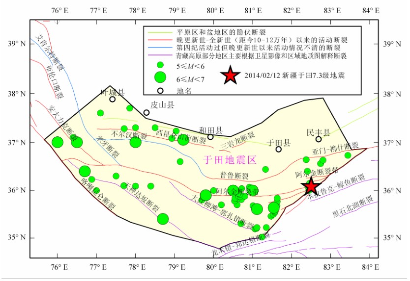 据中国地震台网测定:2014年2月12日17时19分,在新疆维吾尔自治区和田地区于田县(北纬36.1°,东经82.5°)发生MS7.3级地震,震源深度12 km(为便于后文叙述,我们将此次地震暂命名为新疆于田7.3级地震).据新疆维吾尔自治区民政厅报告,截至2月13日7时初步统计,此次地震造成 和田地区于田、民丰、策勒、洛浦、墨玉等5个县6300 余人受灾,900余人紧急转移安置,近300间房屋倒塌或严重损坏,2400余间一般损坏,部分牲畜棚圈损坏,178头(只)牲畜死亡,直接经济损失3300余万元.