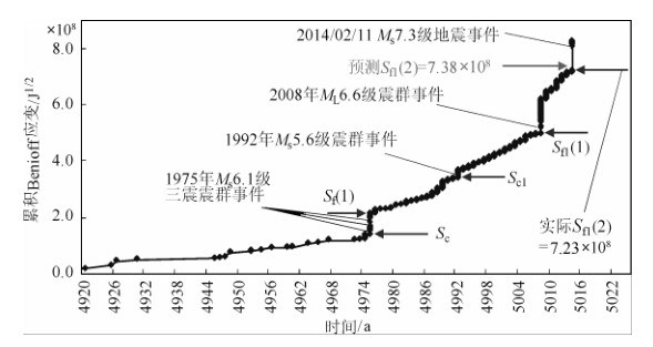 图2示出了于田地震区多锁固段逐次累进性破裂过程中中强震、强震、大震事件之间的力学联系.可看出1975年MS6.1级三震震群事件已使其对应的锁固段发生宏观破裂,之后根据1992年新疆策勒MS5.6级震群事件可较准确地预测到2008年新疆于田—策勒ML6.6级地震在临界失稳点处的应变值,由于ML6.6级震群事件并未使其对应的锁固段破裂到达其峰值强度点,其后必有更大的事件发生,从而可由2008年ML6.6级震群事件起点对应的CBS值,给出2014年新疆于田7.3级地震发震前的CBS值.