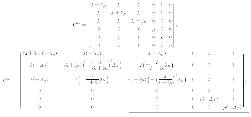 基于弱各向异性理论,具有水平对称轴的高角度裂缝介质弹性系数矩阵 C 可以描述为各向同性背景系数矩阵 C iso与各向异性扰动 C ani之和: