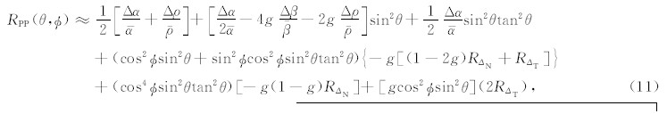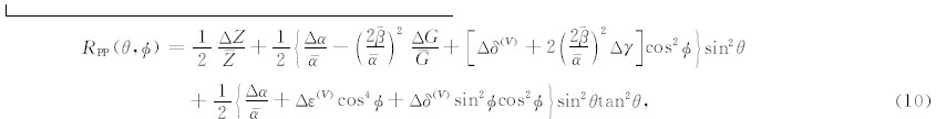 将方程(7)、(8)和(9)带入方程(10),同时基于弱各向异性近似理论,将HTI介质反射系数RPP(θ,φ)可表示为各向同性背景反射系数和各向异性部分扰动相加的近似形式: