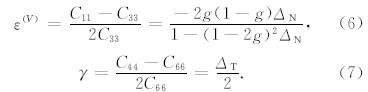 从弹性系数矩阵 C 出发,根据各向异性参数δ(V),ε(V)和γ的定义,结合Schoenberg线性滑动模型得到各向异性参数和裂缝差值之间的关系: