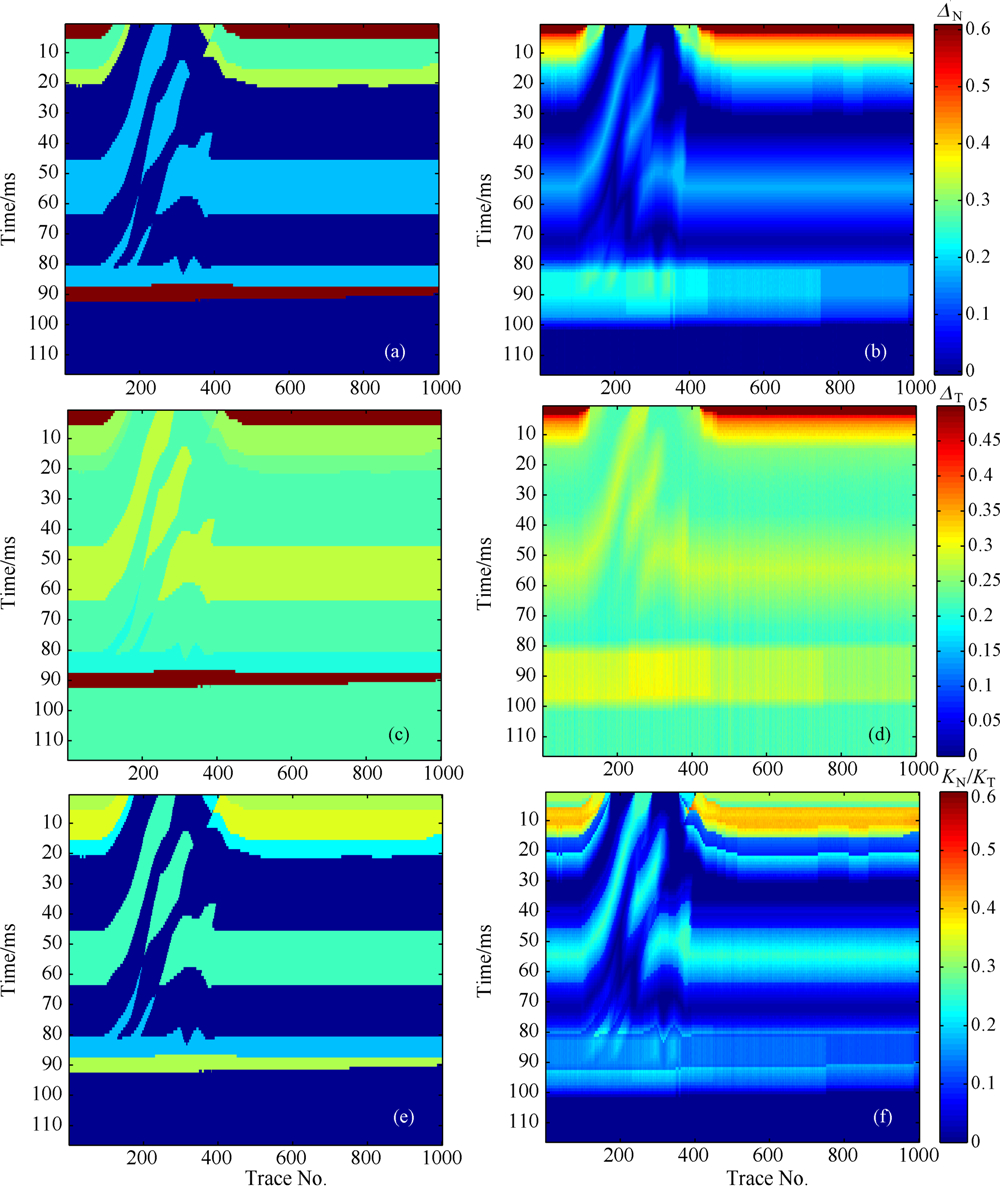 从图4中展示的正向差值ΔN和切向差值ΔT变化特征,可以进一步标定两套储层的位置和储层中裂缝的发育程度,同时表明两套储层中裂缝对各向同性背景介质的影响并不相同.