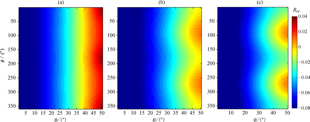 ![]() | 图2 不同流体充填裂缝介质的反射系数特征 (a)缝隙含气;(b)缝隙部分含油水;(c)完全充填. Fig.2 Reflection coefficient variation with incidence and azimuth angle (a)Gas filled;(b)Partially filled;(c)Fluid filled. |