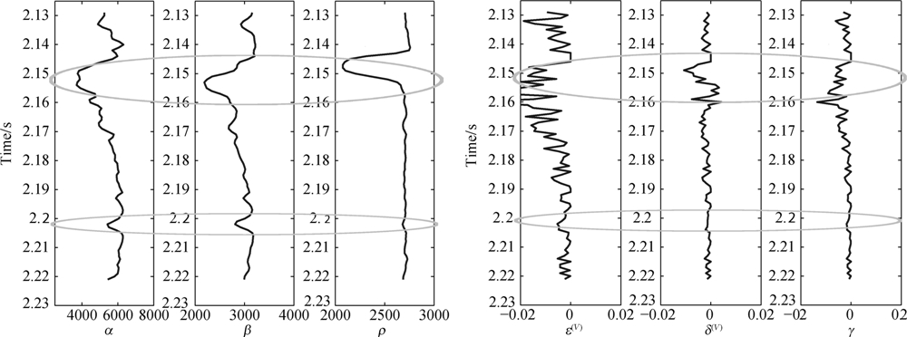 分析A井的纵横波速度和密度曲线,并结合各向异性参数曲线可知,该井通过两套裂缝储层(如图中圈注).对比上下层弹性参数和各向异性参数变化,两套储层的纵横波速度和密度均有减小,各向异性参数的变化也较为明显,但变化幅度不同.