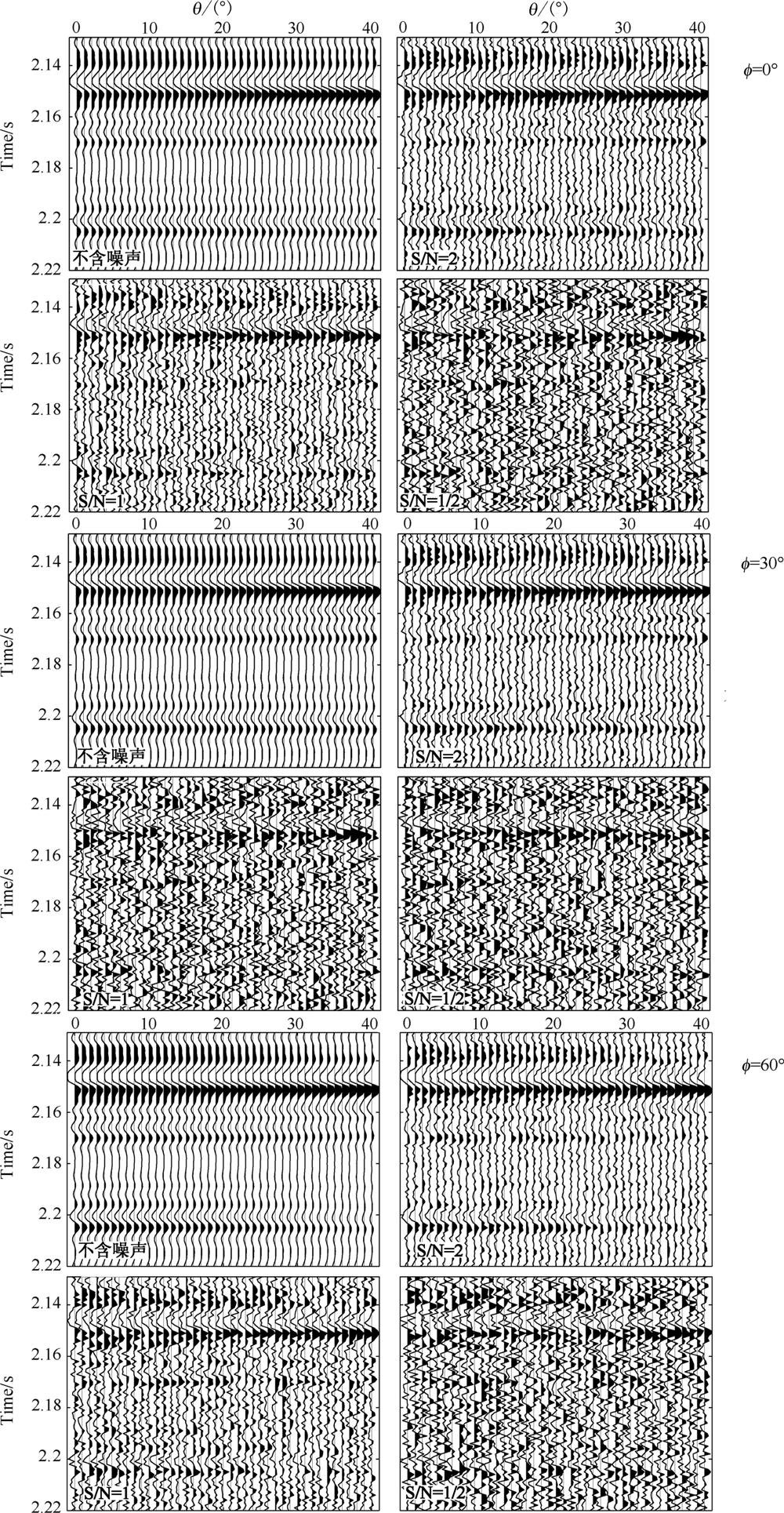 利用A井的合成地震记录对缝隙流体因子的反演算法进行试算.选取拟Zoeppritz方程求解界面精确反射系数,利用45 Hz的Ricker子波,依照褶积模型制作合成地震记录,并添加不同信噪比的随 机噪声.方位角为0°,30°和60°、不同信噪比的合成地震记录分别如图6所示.