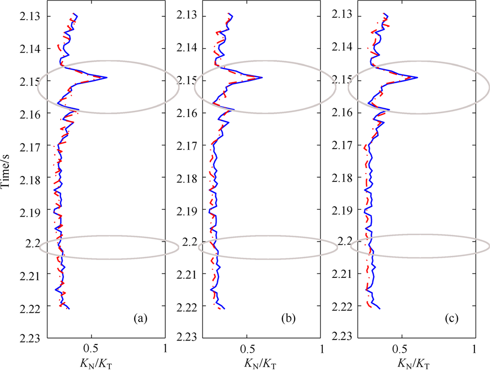 通过反褶积提取不同信噪比,不同方位角的反射系数.按照公式(13)定义,将不同方位角反射系数做差,通过最小二乘反演方法求取裂缝正向差值ΔN和切向差值ΔT,进而求得流体因子KN/KT反演值,其结果如图7所示.