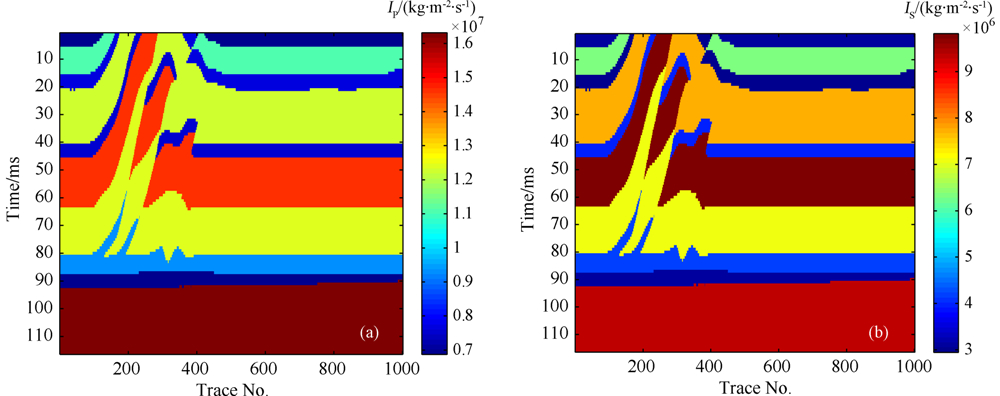 ![]() | 图9 逆掩断层模型的弹性参数 (a)纵波阻抗;(b)横波阻抗. Fig.9 Elastic parameters of overthrust model (a) P wave impedance; (b) S wave impedance. |