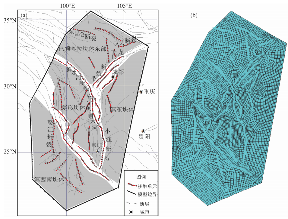 ![]() | 图 2 川滇地区有限元二维接触模型(a)有限元模型构架;(b)有限元模型分网.Fig. 2 2D contact FEA model of Sichuan-Yunnan Region(a)The model region;(b)The mesh of the FEA model. |