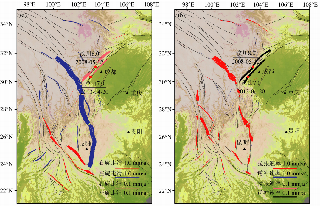 ![]() | 图 3 川滇地壳主要断裂带运动速率模拟结果(a)走滑分量(右旋/左旋);(b)拉张分量(拉张/挤压).Fig. 3 The simulated movement speed of the main faults in Sichuan-Yunnan Region(a)Slip component(right-lateral/left-lateral);(b)Tension component(tensile/compressive). |