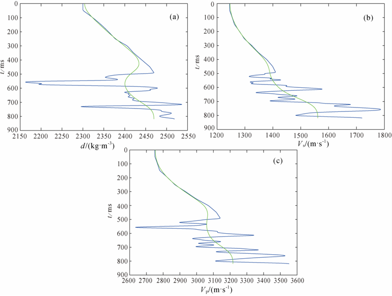 将某口井的实测数据从深度域转换到时间域,将转换后的密度和速度作为地层模型参数,对模型参数进行平滑处理即可得到初始模型. 地层模型参数如图 1(a,b,c)所示,分别为地层模型的密度、横波速度、纵波速度,其中蓝线表示地层模型参数的真实值,绿线表示经过平滑处理的结果,将其作为初始模型.