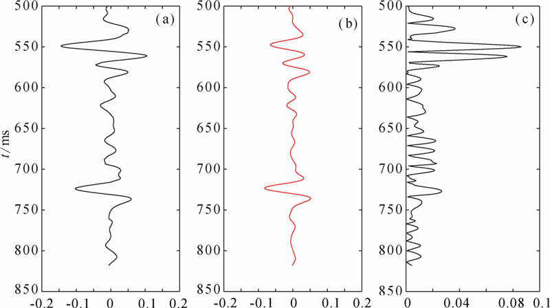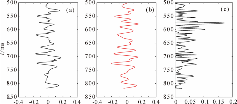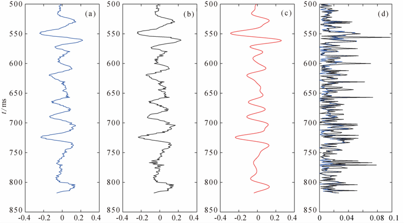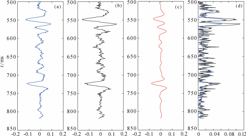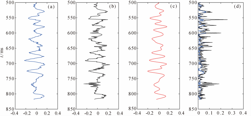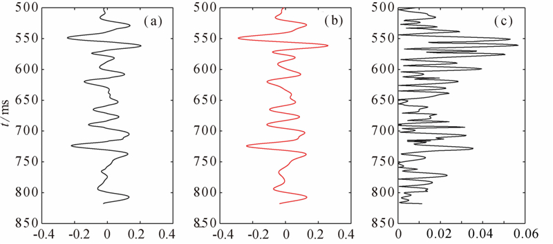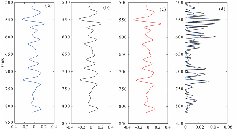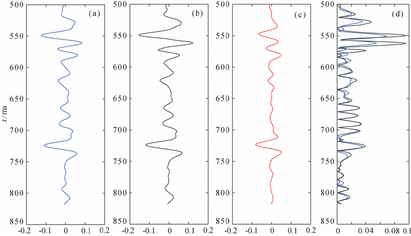 对合成地震记录,分别采用纵波反演、纵波和转换波联合反演方法来估算三参数. 纵波反演的流程和方法与联合反演是一致的,将转换波加权因子η取为0即可. 初始模型采用图 1绿线所示的结果,通过射线追踪计算角度. 反演的结果如图 3、4、5所示,分别为密度比、剪切模量比、体积模量比,其中第一列的蓝线表示纵波和转换波联合反演的结果,第二列的黑线表示单独利用纵波反演的结果,第三列的红线表示待反演参数的真实值,最后一列表示反演结果的绝对误差,其中蓝线表示联合反演结果的误差,黑线表示纵波反演结果的误差. 从反演结果误差统计来看,联合反演结果的误差要明显小于单一纵波反演,精度明显提高,且联合反演的条件数减小,因而反演过程更加稳定,降低了反演的不适定性.