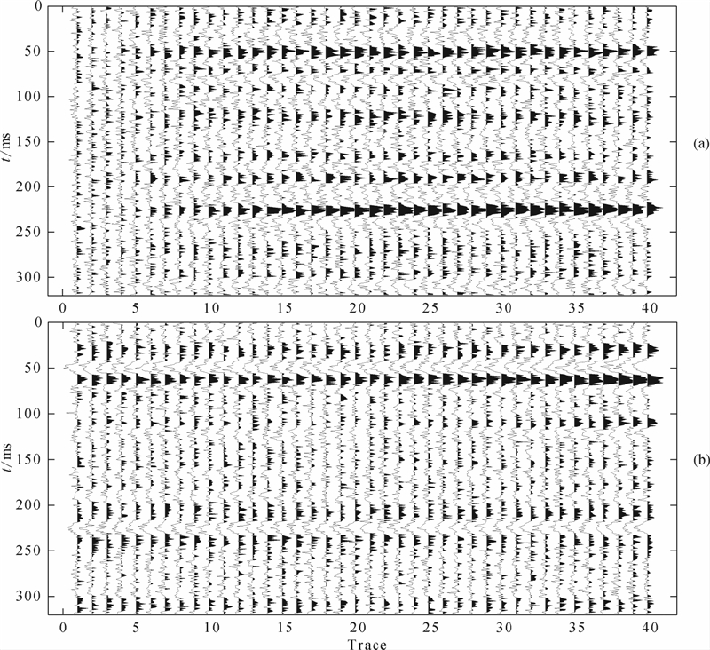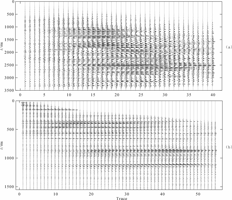 | 图 13 经过动校正的实际叠前地震数据.(a)转换波道集;(b)纵波道集 Fig. 13 Real prestack seismic data after NMO.(a)S-wave data set;(b)P-wave data set |