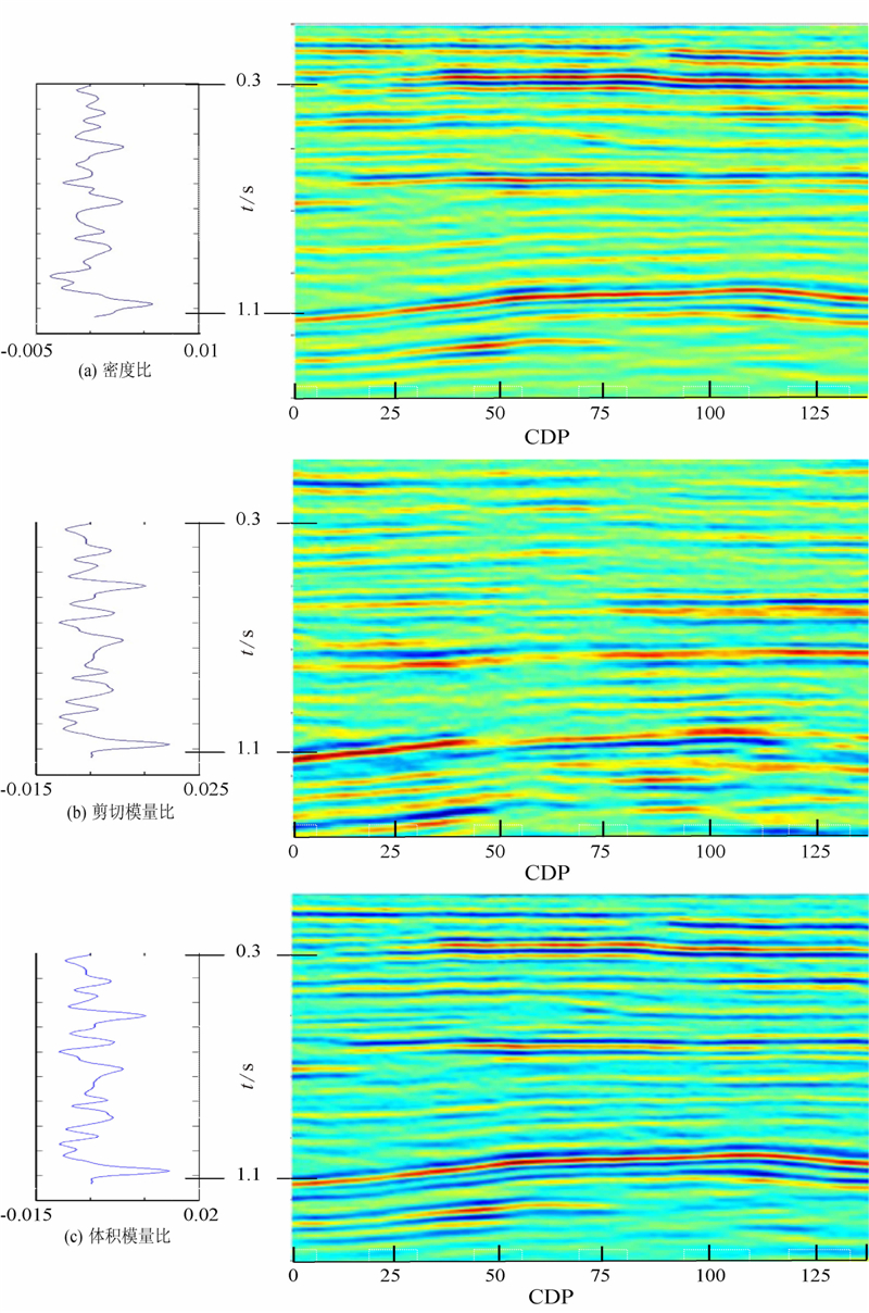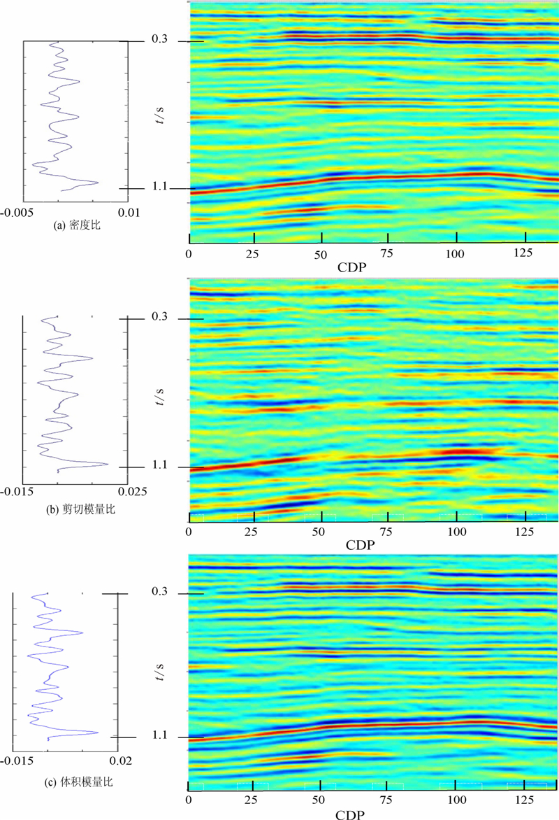 (1)反演的密度比、剪切模量比、体积模量比三参数具有重要的地质意义,可以更好地识别岩性以及指示油气;