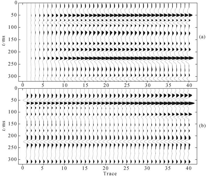 | 图 2 合成地震记录.(a)转换波剖面;(b)纵波剖面 Fig. 2 Synthetic data.(a)S-wave section;(b)P-wave section |