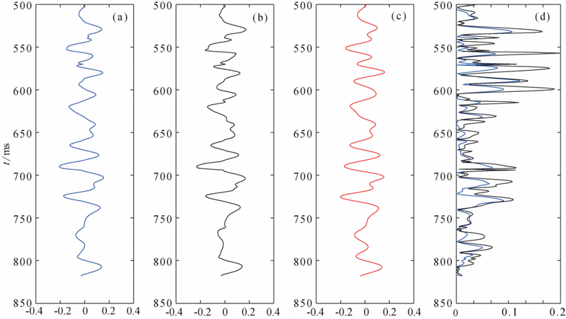 | 图 11 剪切模量比.(a)联合反演;(b)纵波反演;(c)由模型参数计算的真实值;(d)误差比较 Fig. 11 S-wave modulus contrast.(a)Joint inversion result;(b)PP inversion result;(c)Real value;(d)Error comparison |