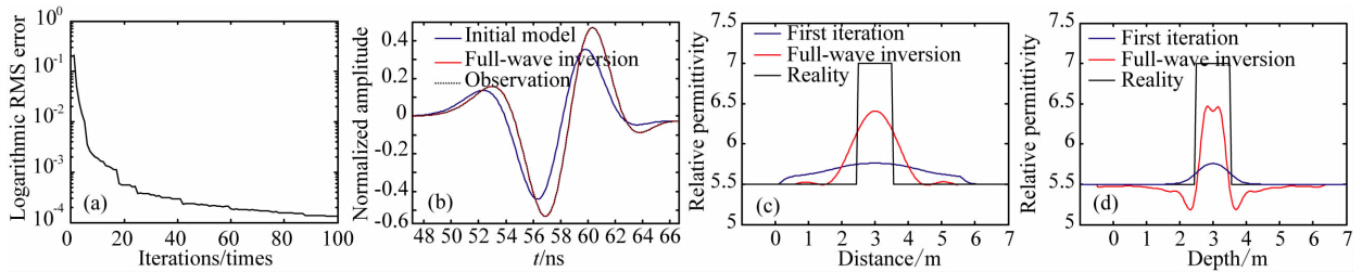 ![]() | 图 3(a)目标函数;(b)子波匹配情况;(c)深度3 m介电常数切线(沿A-A所做切线);(d)水平3 m介电常数切线(沿B-B所做切线) Fig. 3(a)Objective function;(b)The wavelet matching conditions;(c)The permittivity in the depth of 3M(along A-A line);(d)The permittivity in the distance of 3M(along B-B line) |