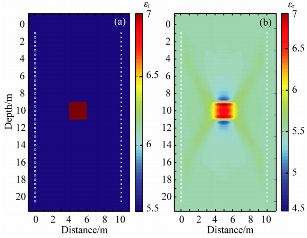 模型2为如图 4a所示,发射井与接收井深度均为20.5 m,两井之间距离10 m,目标体为矩形,其中心点位于垂直距离10 m、水平距离5 m的位置,该矩形区域为正方形,边长为2 m,其介电常数为εr=7,电导率为σ=0.0001 S·m-1.围岩介电常数为εr=5.5,电导率为σ=0.0001 S·m-1.发射天 线水平位置为0 m,垂直位置从1 m开始,到20.5 m结束,共40个位置,间隔0.5 m;接收天线水平位置位于10 m,垂直位置从1 m开始,到20.5 m结束,同样共40个位置,间隔0.5 m.