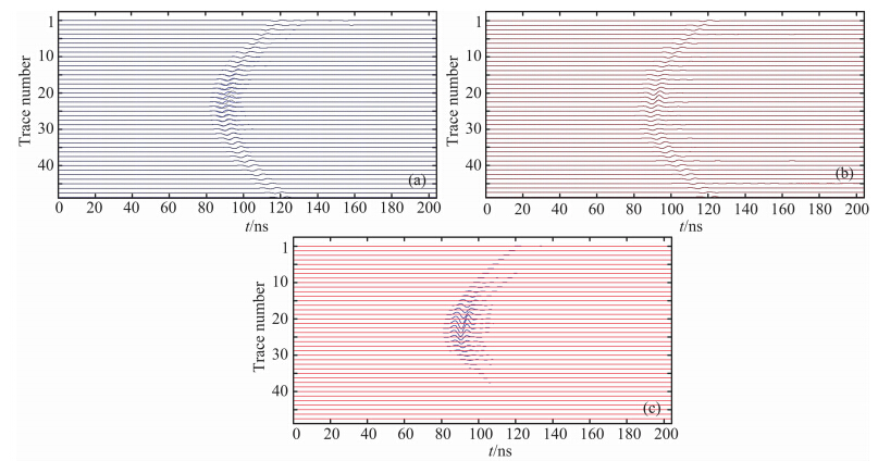 图 5给出了由第20个源(Depth:10.5 m)发射,介电常 数反演后所有接收器接收的波形与初始模型及实测模型的对比.从图中可以明显的看到两者之间的差别.图 5b中能够看出反演后结果与实测数据重合的非常好.为了进一步观察残差,图 5c中可以看到相比初始模型与实测数据的残差,反演后结果与实测数据残差几乎为零.