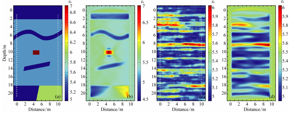 从图 6d反演结果中可以看出对于该尺寸相关长度的随机介质,本文的反演方法能够较清晰的分辨出0.5 m以上的薄层.高介电常数值能够清晰 看到的部分为(从上到下):3.5 m深度反演区域左 侧的高值薄层、5 m深度附近薄层、8 m深度附近薄层、14 m深度靠近发射源位置的高值区域,18 m深度右侧部分.而14 m右侧部分两个相连的更薄层则只能分辨出相对高值的一个.对于小于0.5 m的微观结构,暂不能很好的区分开来.该反演结果能够很准确的完成层状结构划分的问题.